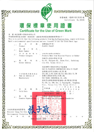 南亞塑膠棧板有效減少傳統木棧板對自然林木砍伐破壞,本著對環保貢獻之決心,進一步申請為環保標章產品。塑膠材質處理後可100%再回收利用,除可有效節省資源外,更可達到降低污染之目的。協助社會回收塑膠再利用,降低塑膠廢棄物遭棄置並對環境造成危害之機會,共創永續環境、美好家園。